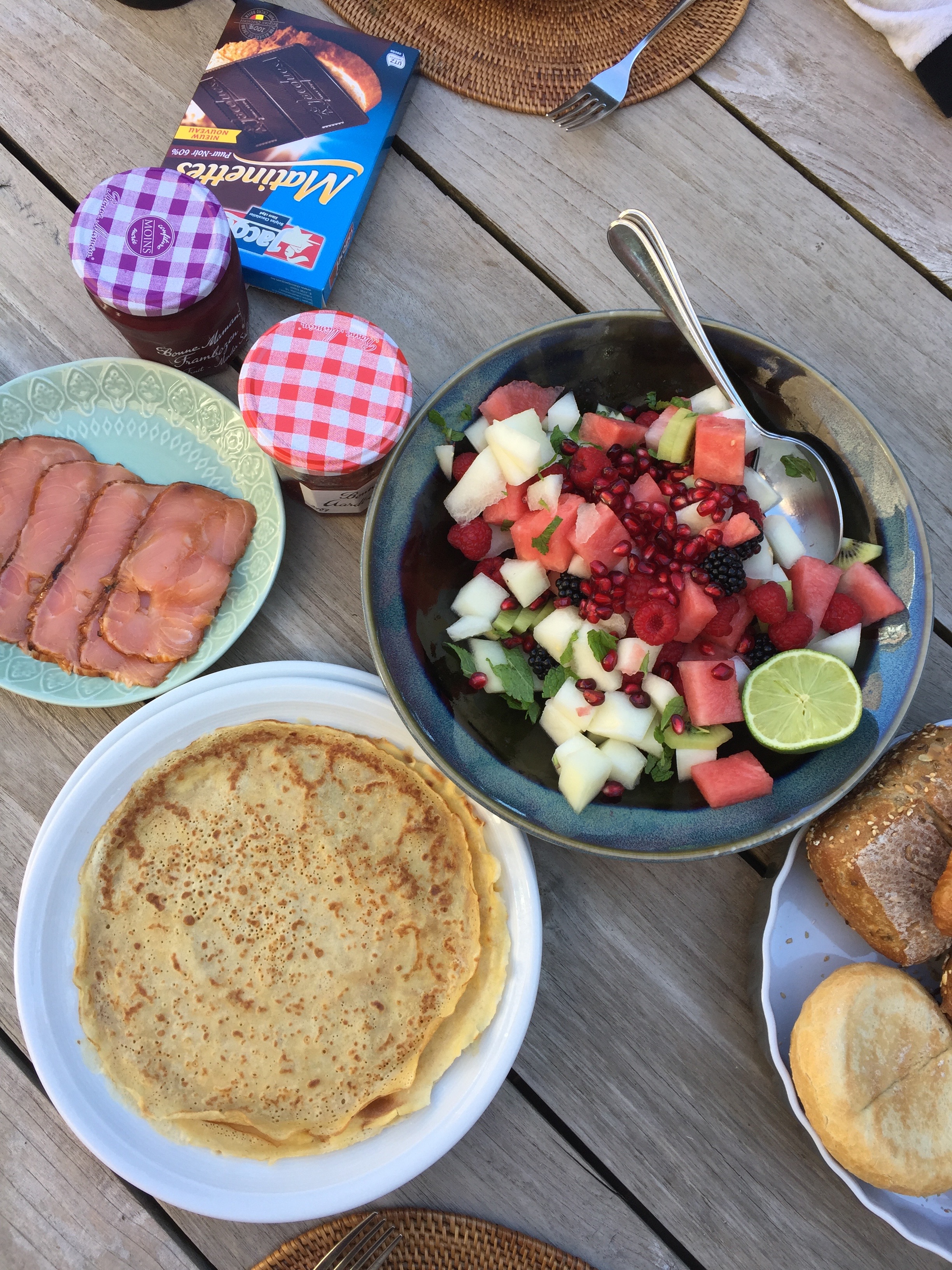 Als we meer tijd hebben, komt er natuurlijk ook meer op tafel. Niet alleen fruit maar ook pannenkoeken of wafels. Een lekkere smoothier erbij om het af te maken. We kunnen dan ook gemakkelijk een uur aan tafel zitten. Muziekje, magazine of een goed boek en dan nog een tweede koffietje. Heerlijk om de dag zo relax te beginnen.