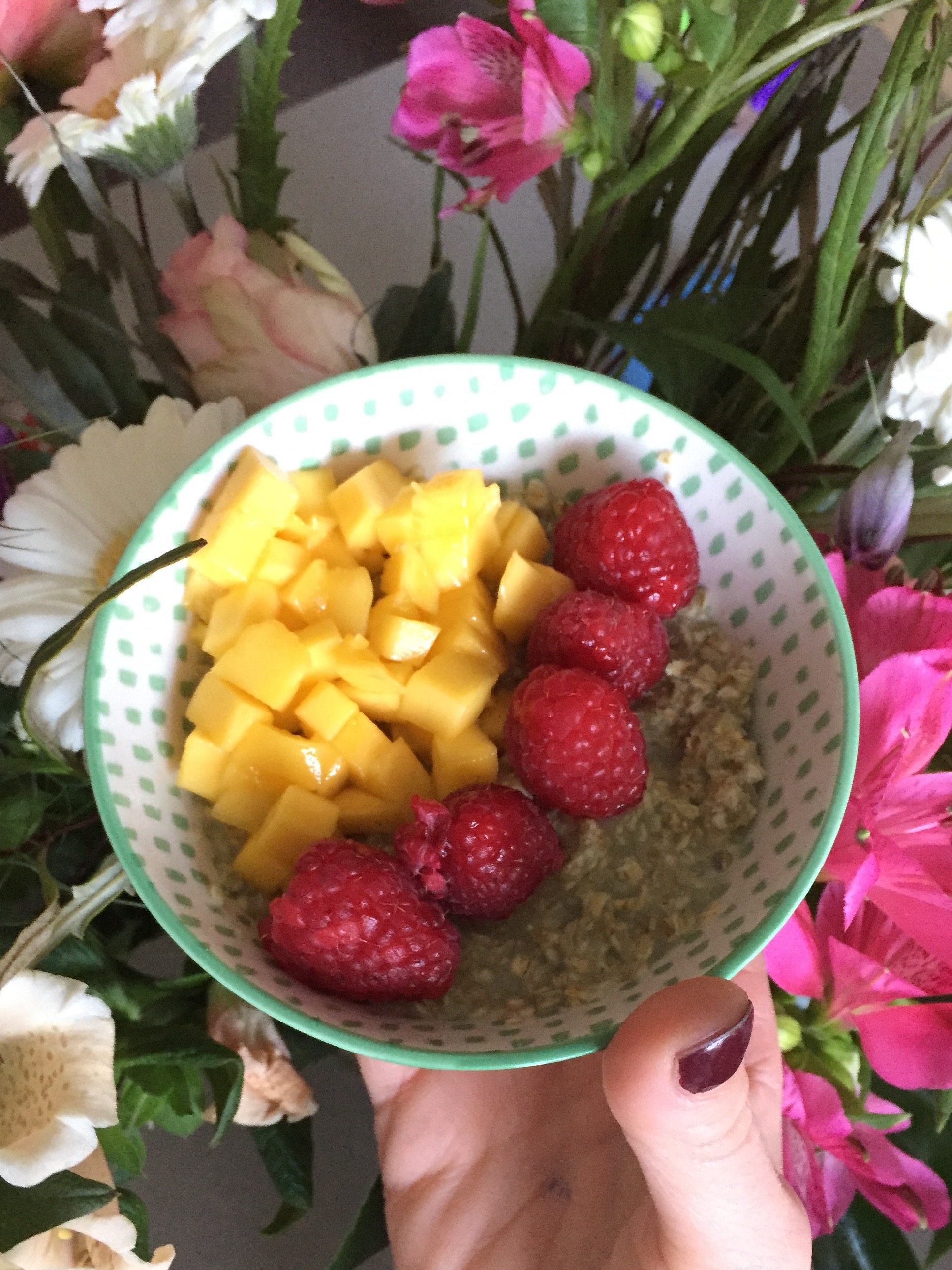 Ik maak havermoutpap met water uit de waterkoker en laat dit even onder een bordje wellen. Super handig, geen aangebrande potten meer en je hebt tijd om je fruit klaar te maken. In mijn post over Iedereen Eet Mee en snelle ontbijtjes kan je hier wat meer informatie over vinden.