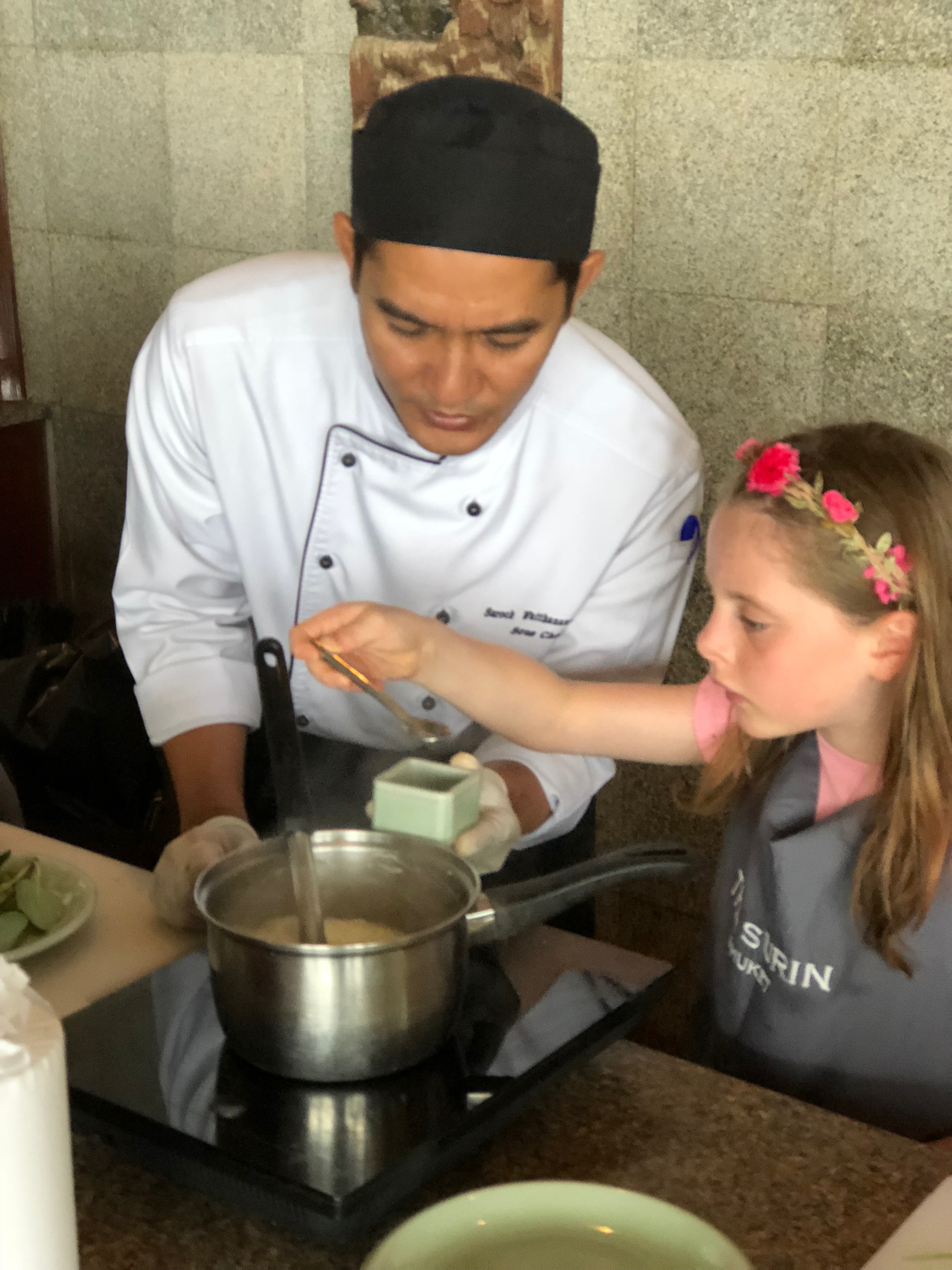 In Thailand kan je quasi op elk moment van de dag super lekker en vers eten. Je kan er lokale specialiteiten eten in kleine eetkraampjes langs de weg, of zet je even voor een kom pad thai in een klein restaurantje tussen de locals. Wil je het wat chiquer dan zijn er de elegante rooftopbars in Bangkok of de hippe strandclubs op de eilanden. De Thaise keuken is inderdaad pikant, maar als je zegt dat het voor de kids is dan houden ze daar zeker rekening mee. We hebben geproefd van gemarineerde brochettes, curry’s, mierzoete Thaise dessertjes, heerlijke kokospannenkoekjes, Thai beef salad en nog zo veel meer. Tijdens één van de regendagen hebben we ook kookles gevolgd. Super leuk om te doen en heel fijn om de kids ook alles te zien proeven.