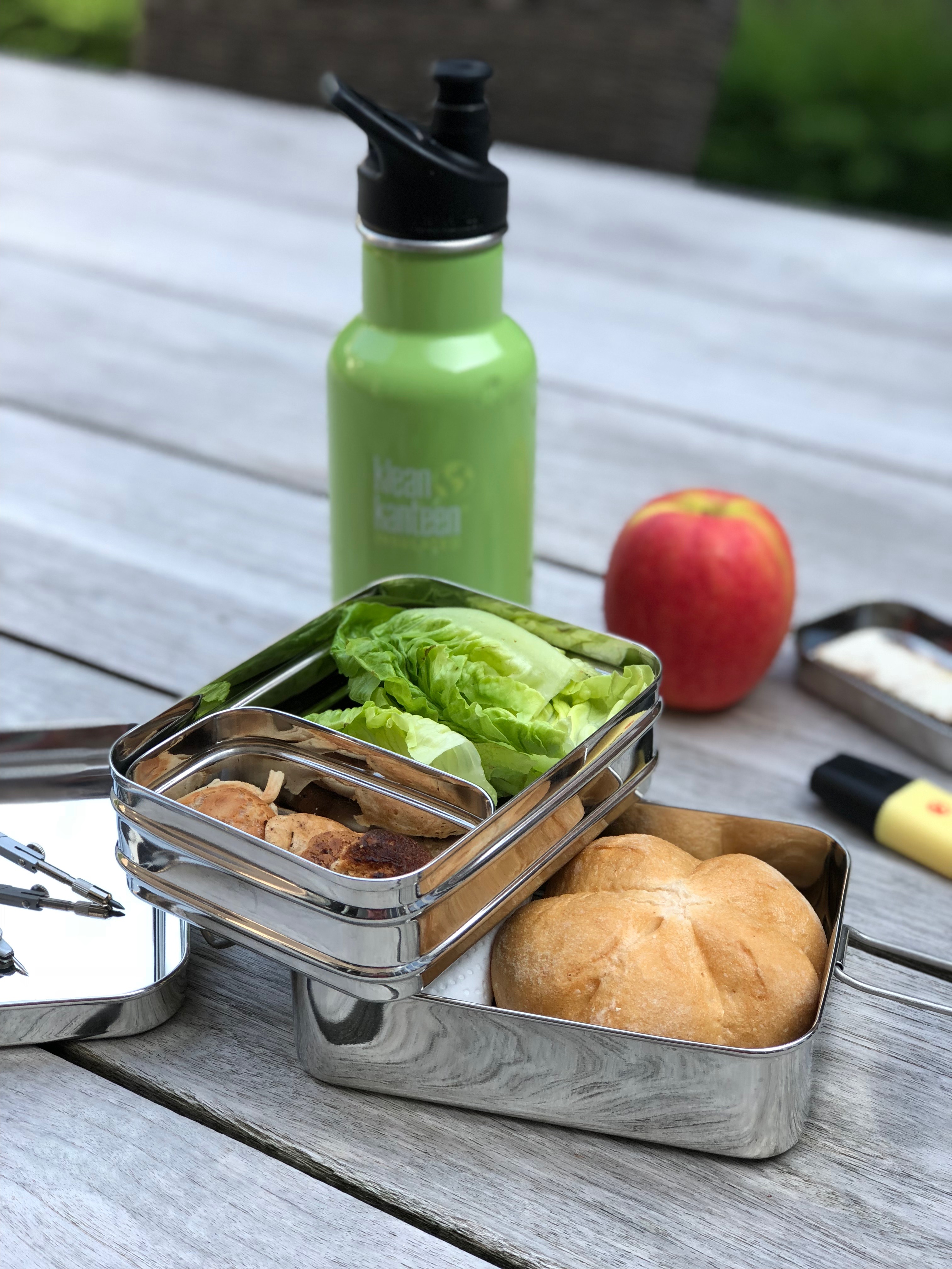 Mijn kids krijgen regelmatig spring rolls of een salade mee. Ik spreek dan ook liever van een lunchbox dan van een brooddoos. Het probleem is dat ze niet graag boterhambeleg eten dus als ik boterhammetjes wil meegeven is dit meestal met choco of rosbief. Dat is echt zowat het enige dat ze op hun boterhammen lusten. De mini’s vinden namelijk dat boterhammen met beleg niet fris ruiken als ze hun lunchbox openen en dan hebben ze geen honger meer. Ik kan ze hier eigenlijk geen ongelijk geven, ik ben zelf ook niet zo een fan van een brooddoos. Dit jaar proberen we dan maar eens de stalen Eco lunchboxes: plasticvrij, gemakkelijk in onderhoud en hier blijven geen luchtjes in hangen. Sinds vorig jaar hebben we ook allemaal een thermos van Klean Kanteen. Ik geef hier smoothies in mee maar ook soep op koudere dagen. Die blijven echt lekker warm (of koud) en nog belangrijker, ze lekken niet in de boekentassen.