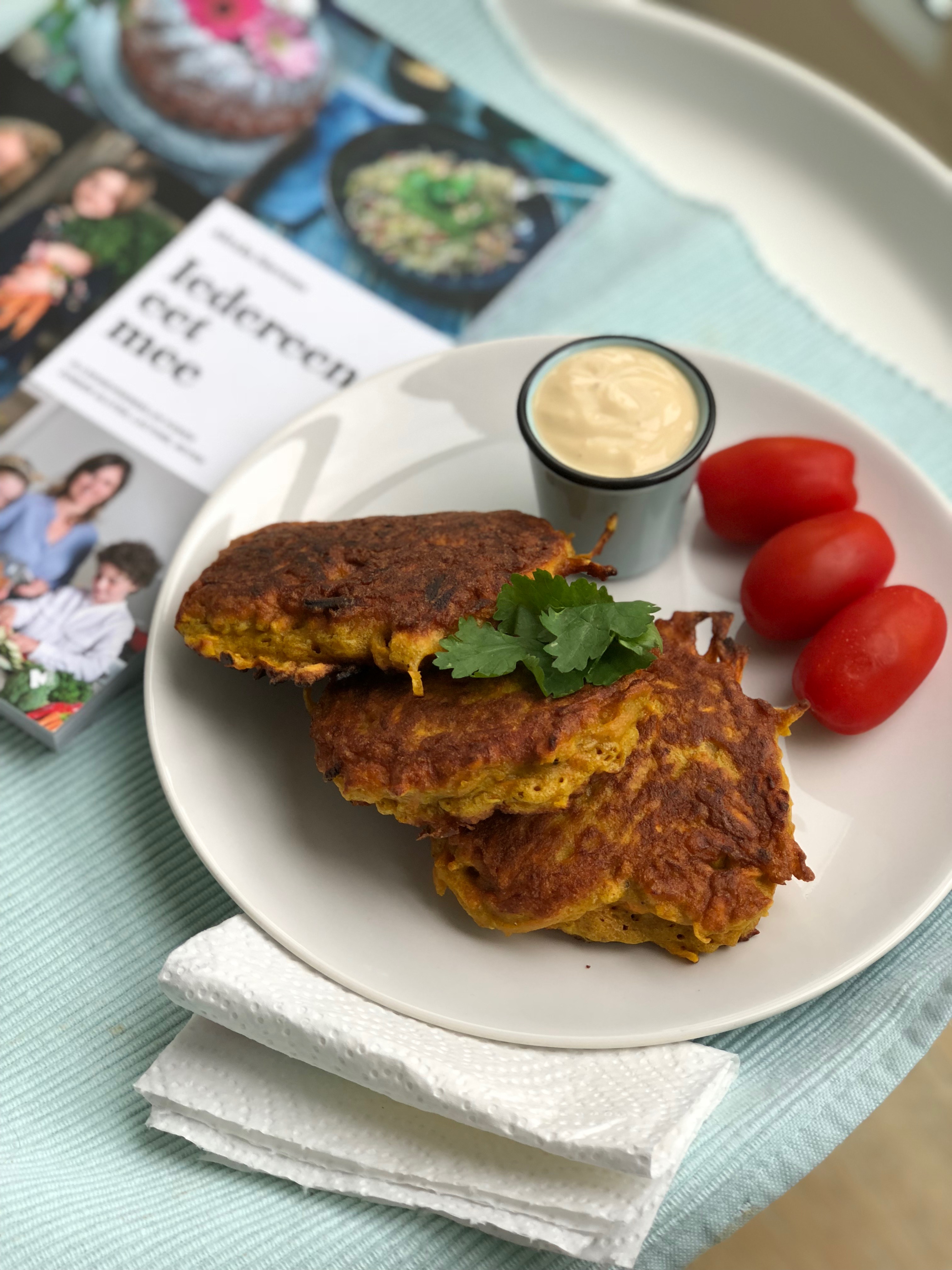 - Zoete aardappelfritters met koriander en tamarimayo (receptje kan je onderaan vinden)