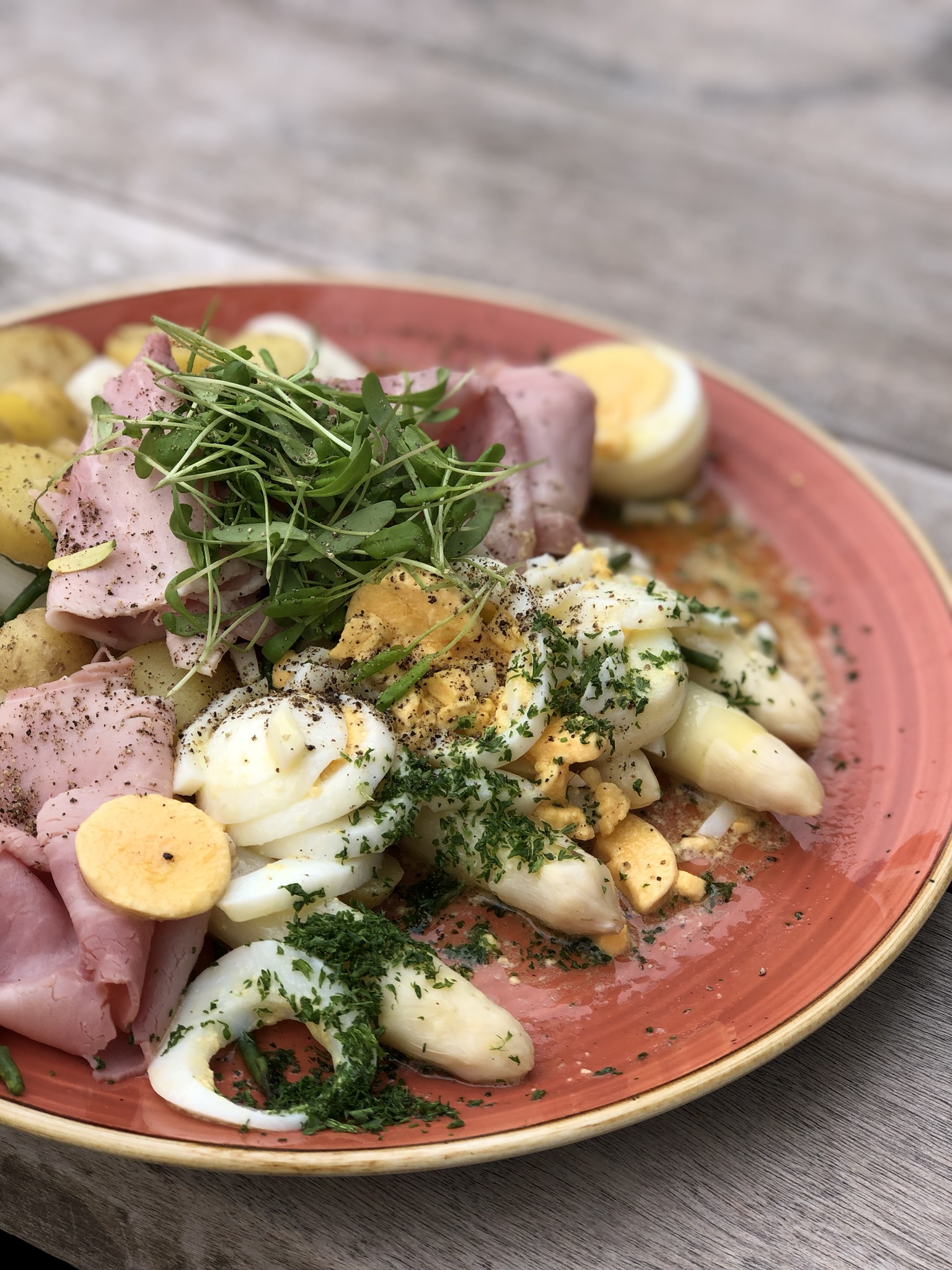 - Dresseer je bord met asperges, de eieren, wat zeekraal, krieltjes en gekookte ham.