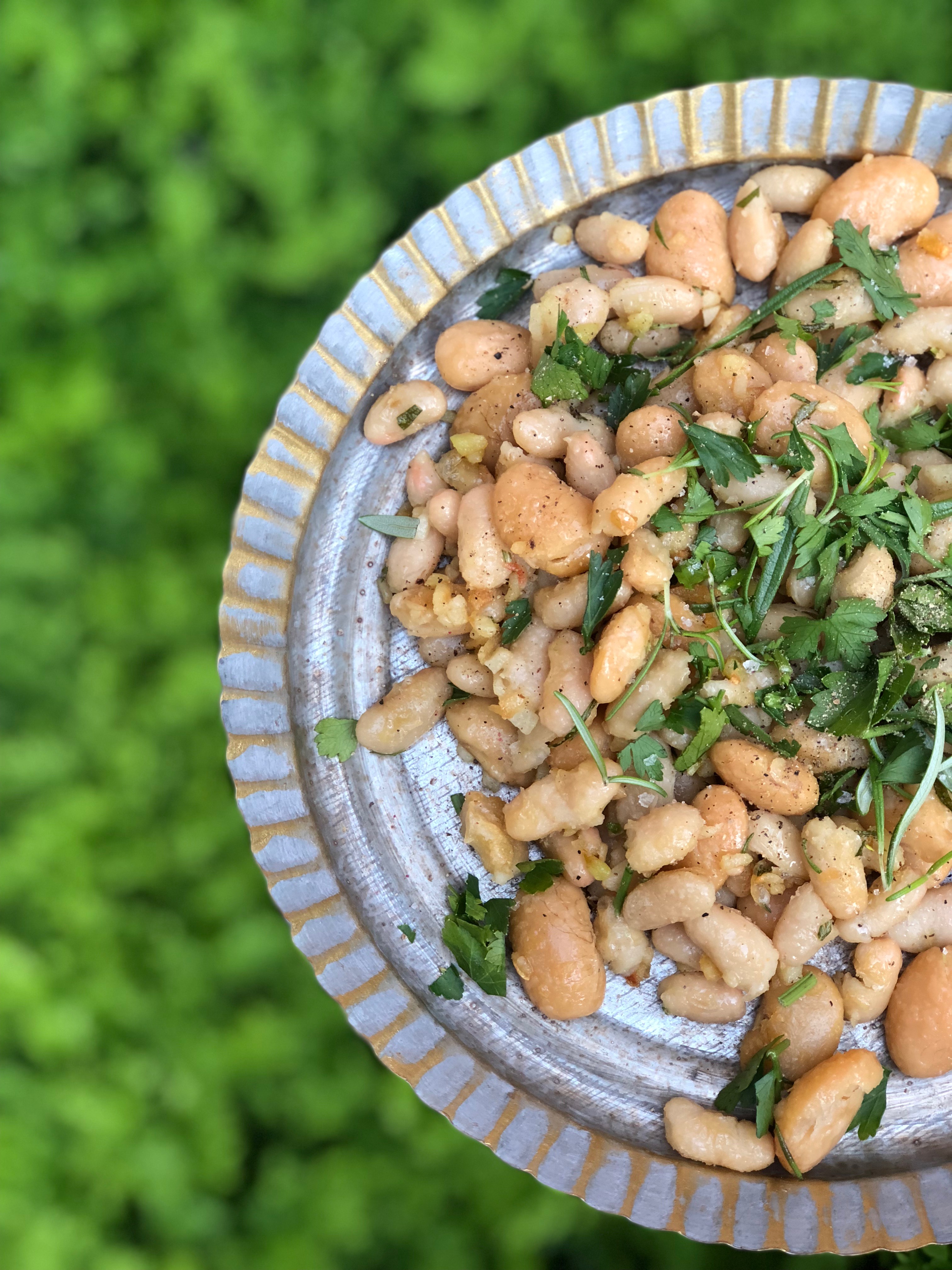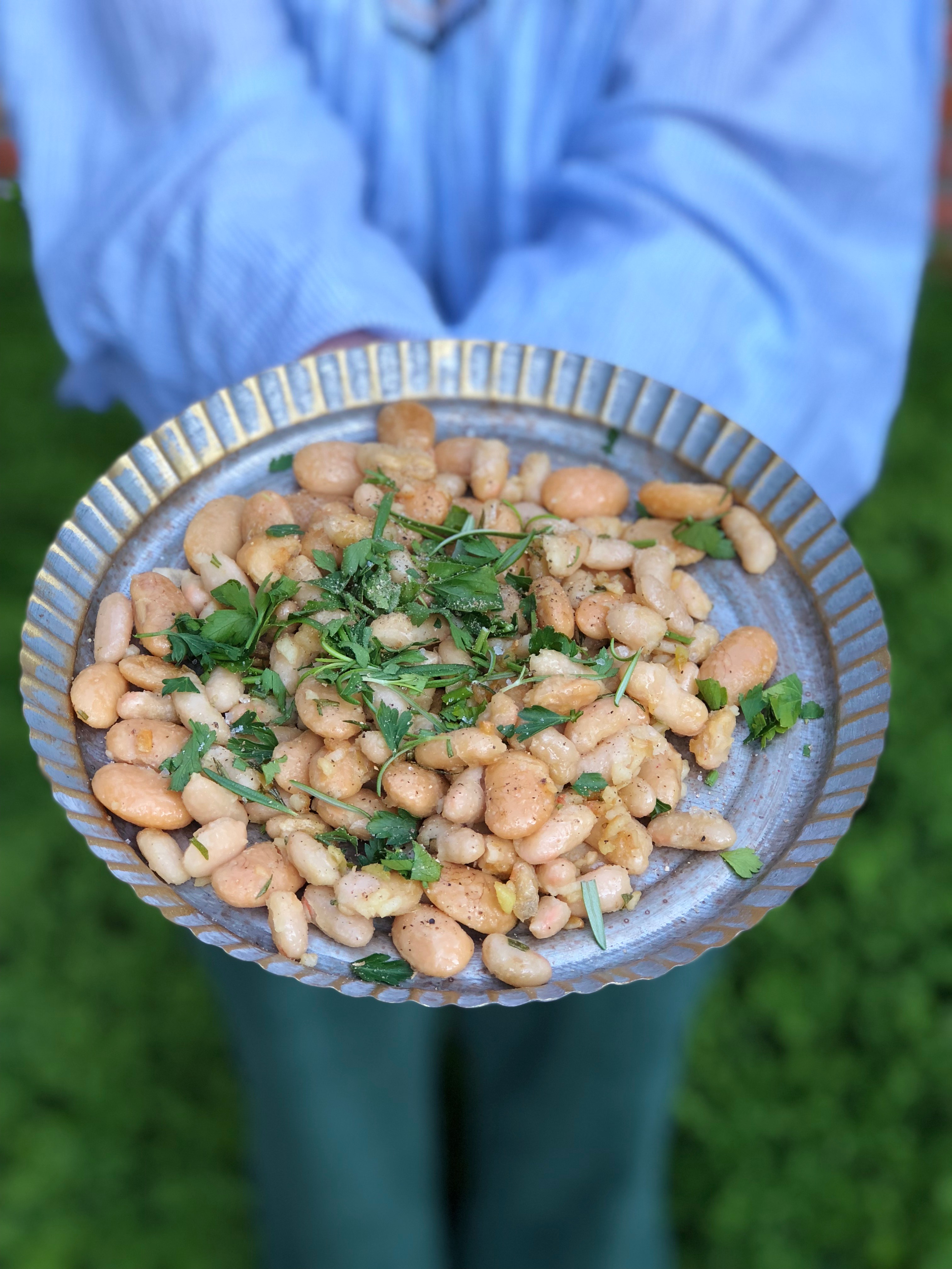 - Schep de bonen op een bord en werk af met versnipperde peterselie, zwarte peper, fleur de sel en nog wat olie.