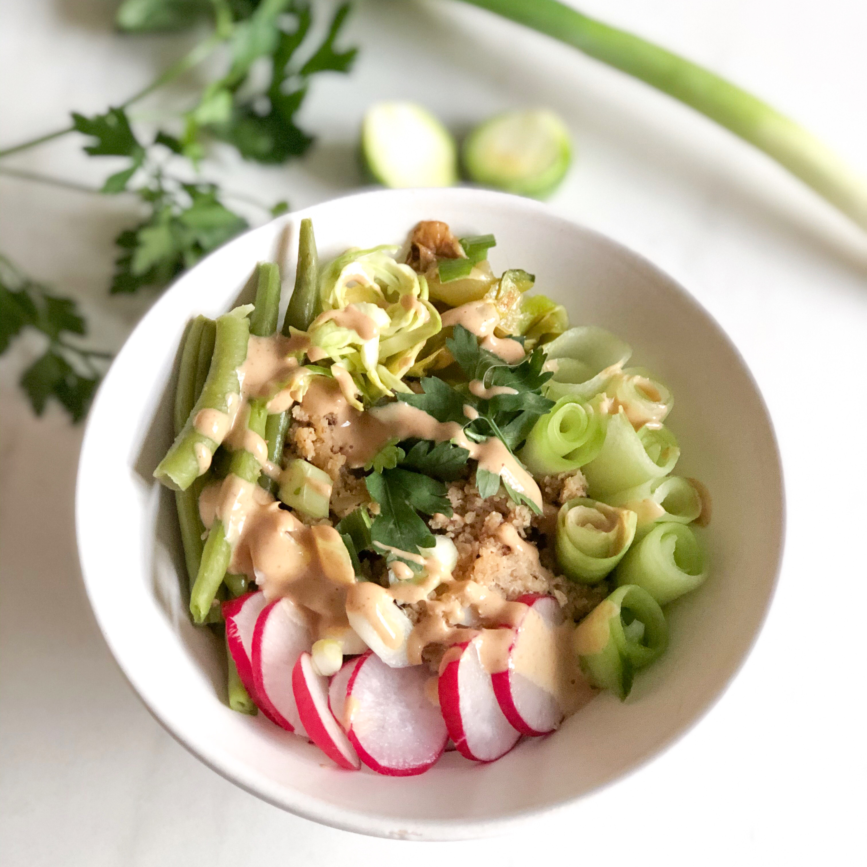 De basis van een Buddha Bowl is altijd dezelfde namelijk: granen zoals quinoa of rijst, geroosterde of rauwe groenten en proteïnen die meestal uit peulvruchten zoals kikkererwten of linzen komen. Verder worden er nog toppings en dressing naar keuze aan toegevoegd: zaden, kruiden soms hummus of een tapenade. Een Buddha Bowl is echt super handig om je restjes in te verwerken. Ik maakte dit weekend bijvoorbeeld een Buddha Bowl met bloemkoolrijst, courgette, boontjes en een sausje van kokos en pinda. Finger licking good.
