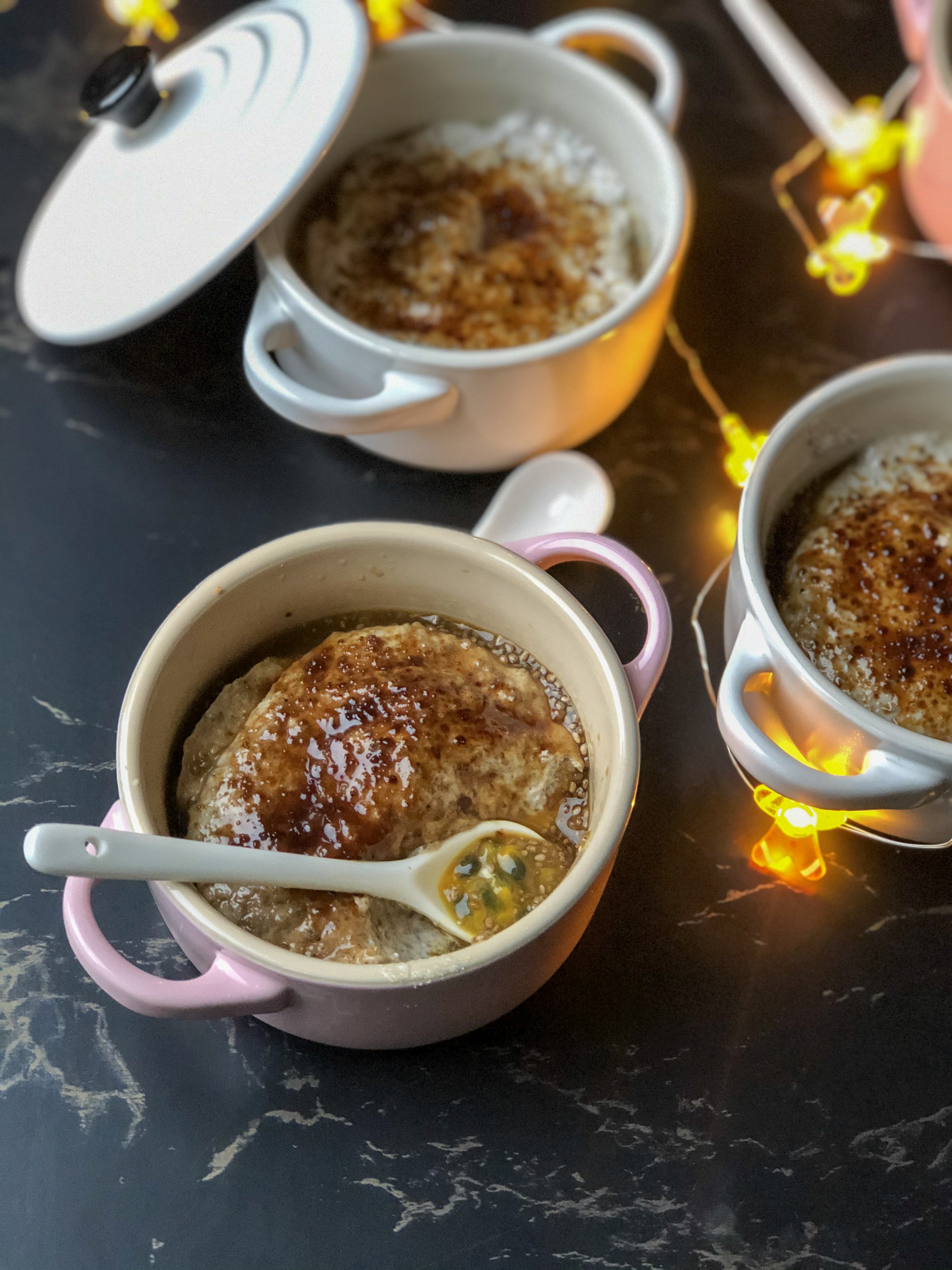 Crème brûlée met passievruchten, chia en kokos