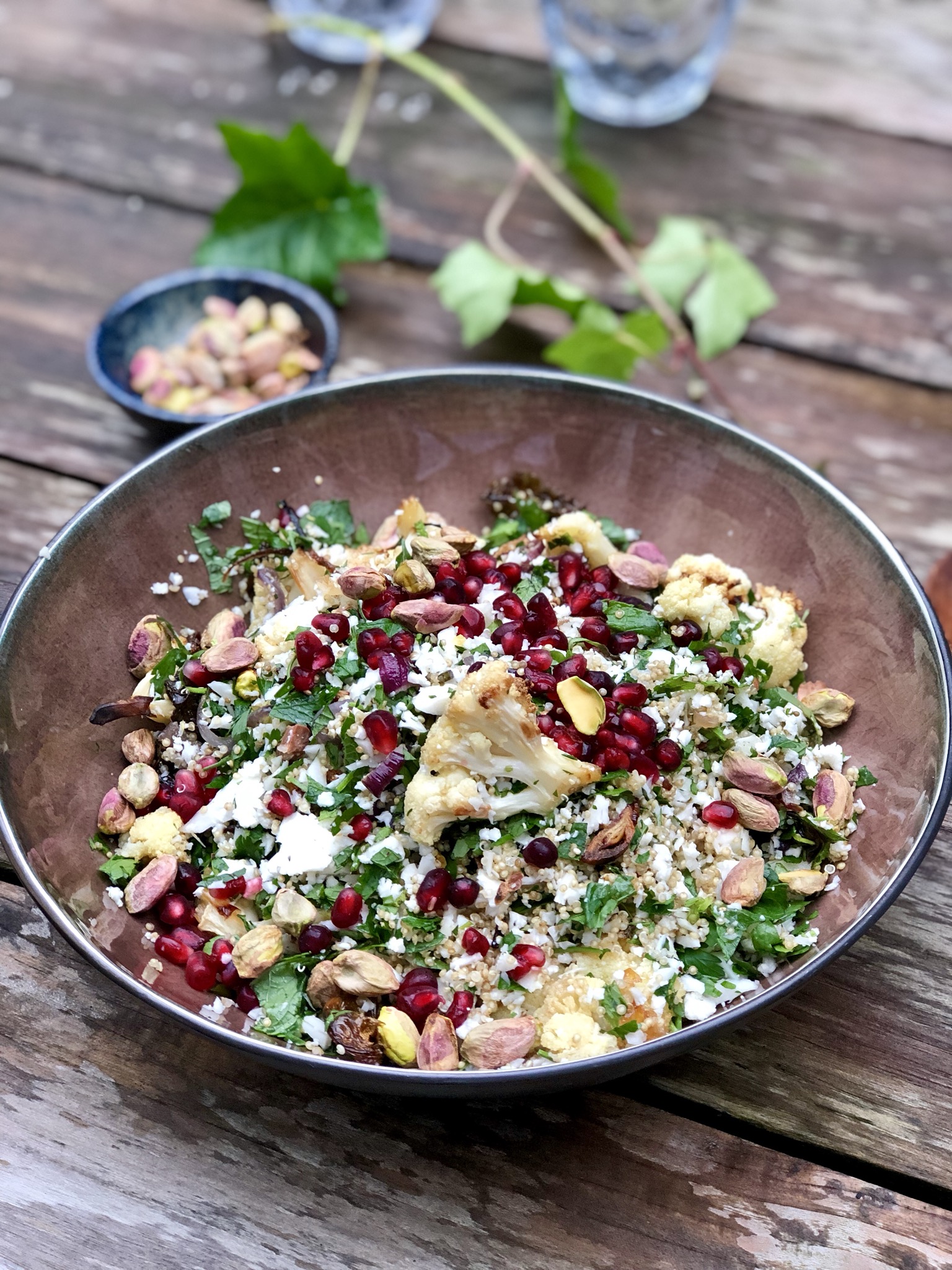 Met deze tropische temperaturen smaakt niets lekkerder dan een frisse salade. Vandaag een lekker receptje voor bloemkoolsalade met pistachenoten. Als kind vond ik bloemkool niet lekker: plat gekookt met witte saus of currysaus. Brr als ik er aan terugdenk krijg ik nog koude rillingen. En kijk wat voor lekkers we nu allemaal met bloemkool maken: pizza, rijst, salades, ovenschotels. Gwyneth Paltrow maakt er zelfs smoothies mee maar geloof me (ik heb het geprobeerd) dat is een brug te ver.