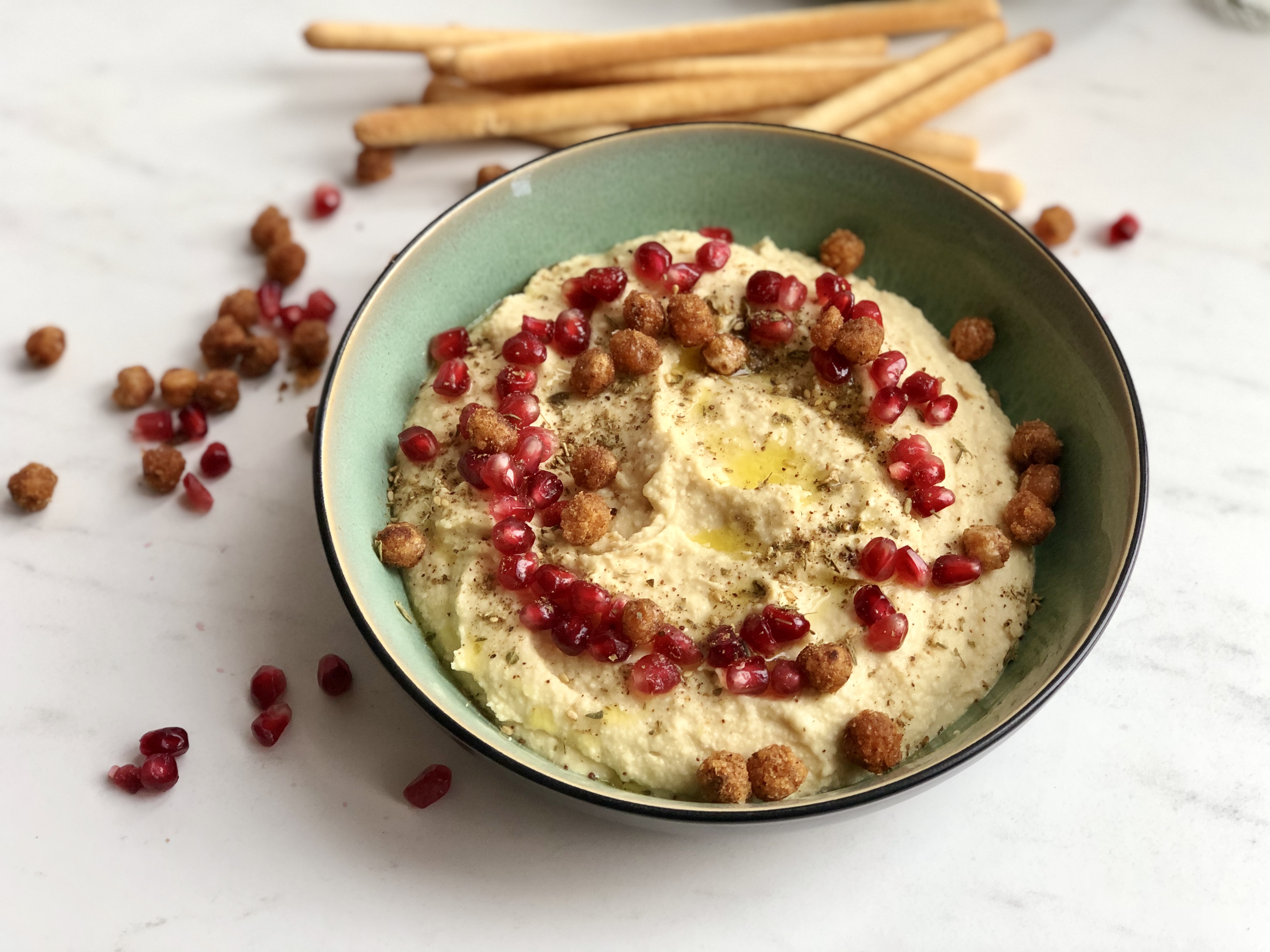 - Werk de hummus af met de granaatappelpitjes, za'atar, olijfolie en wat zwarte peper en zeezout.