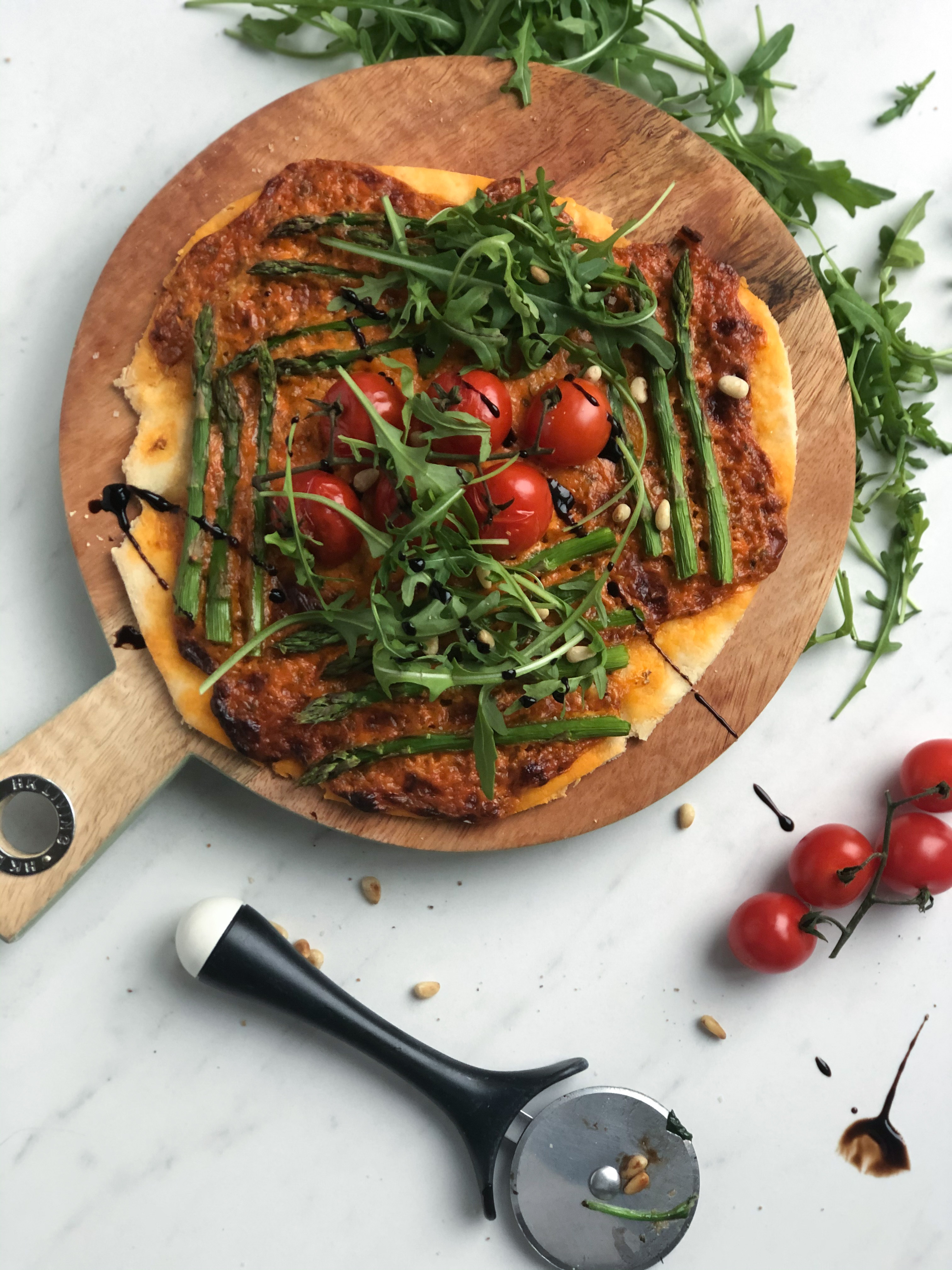 Homemade pizza met mascarpone, tomaat en asperges