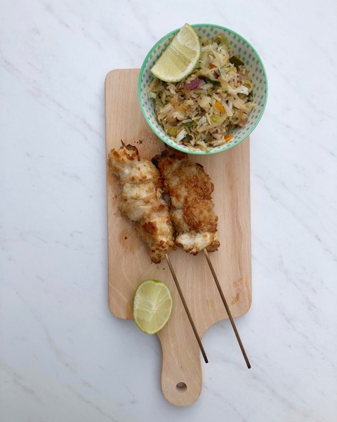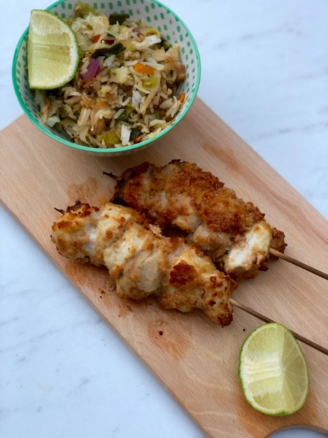 - Maak 8 à 12 saté's met de stukjes kip.
