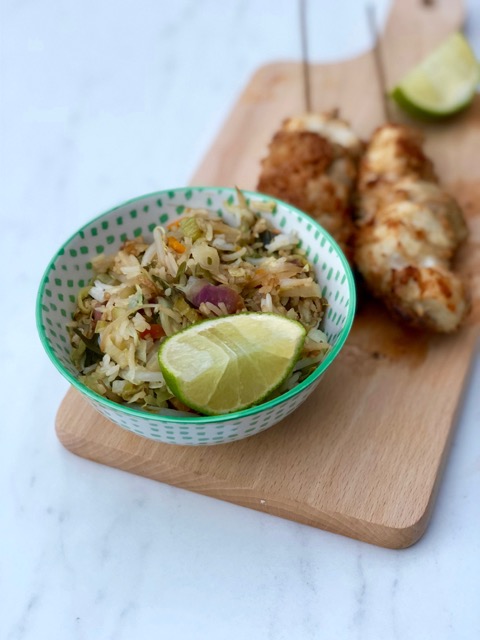 Je kan de stukjes kip kleiner snijden en op kleine prikkers steken en die dan opdienen als aperitiefhapje. Ik heb daar geen geduld voor, dus ik maak 2 saté’s per persoon en dien dit op met gewokte groenten, nasi goreng of een salade.