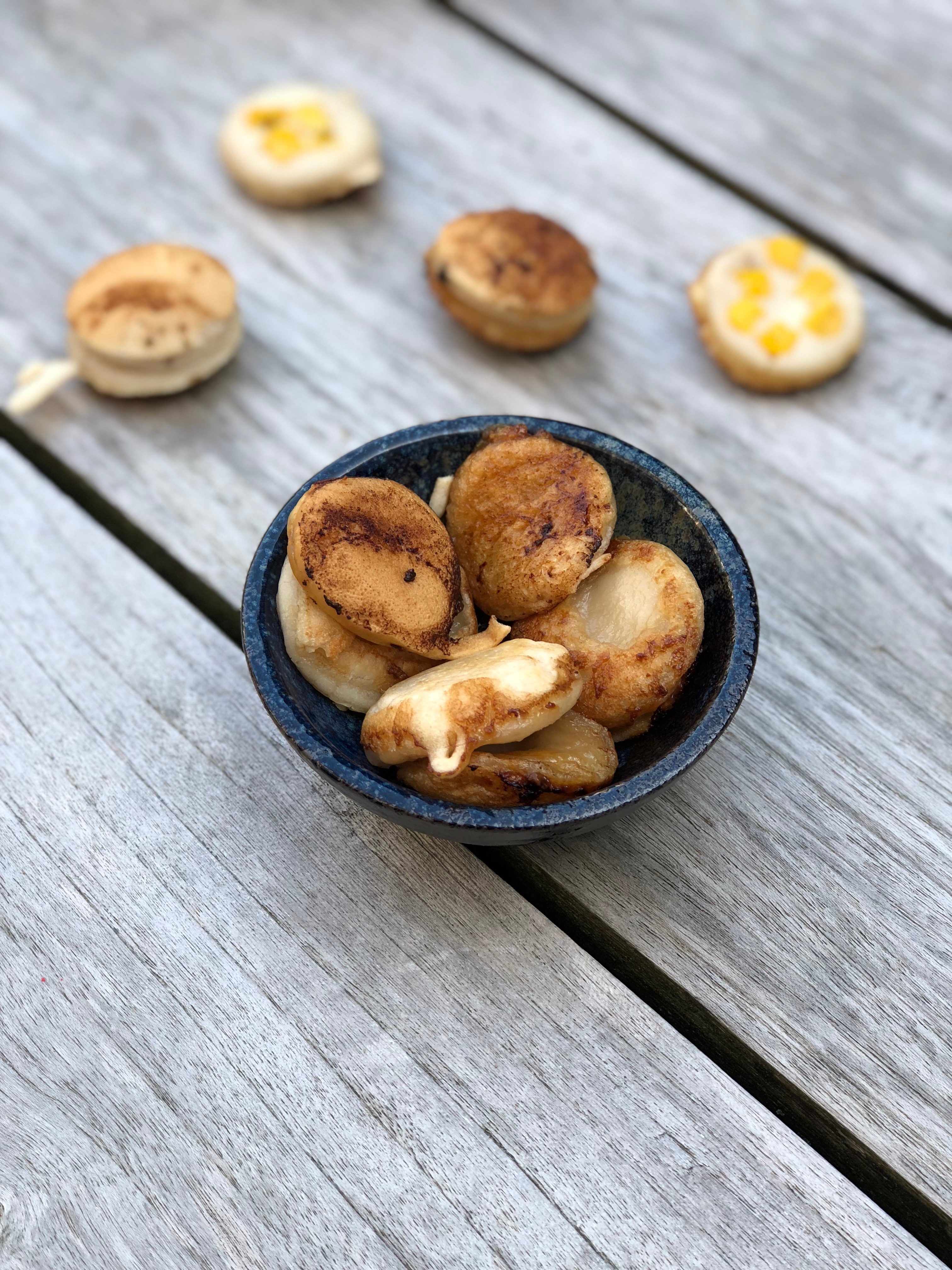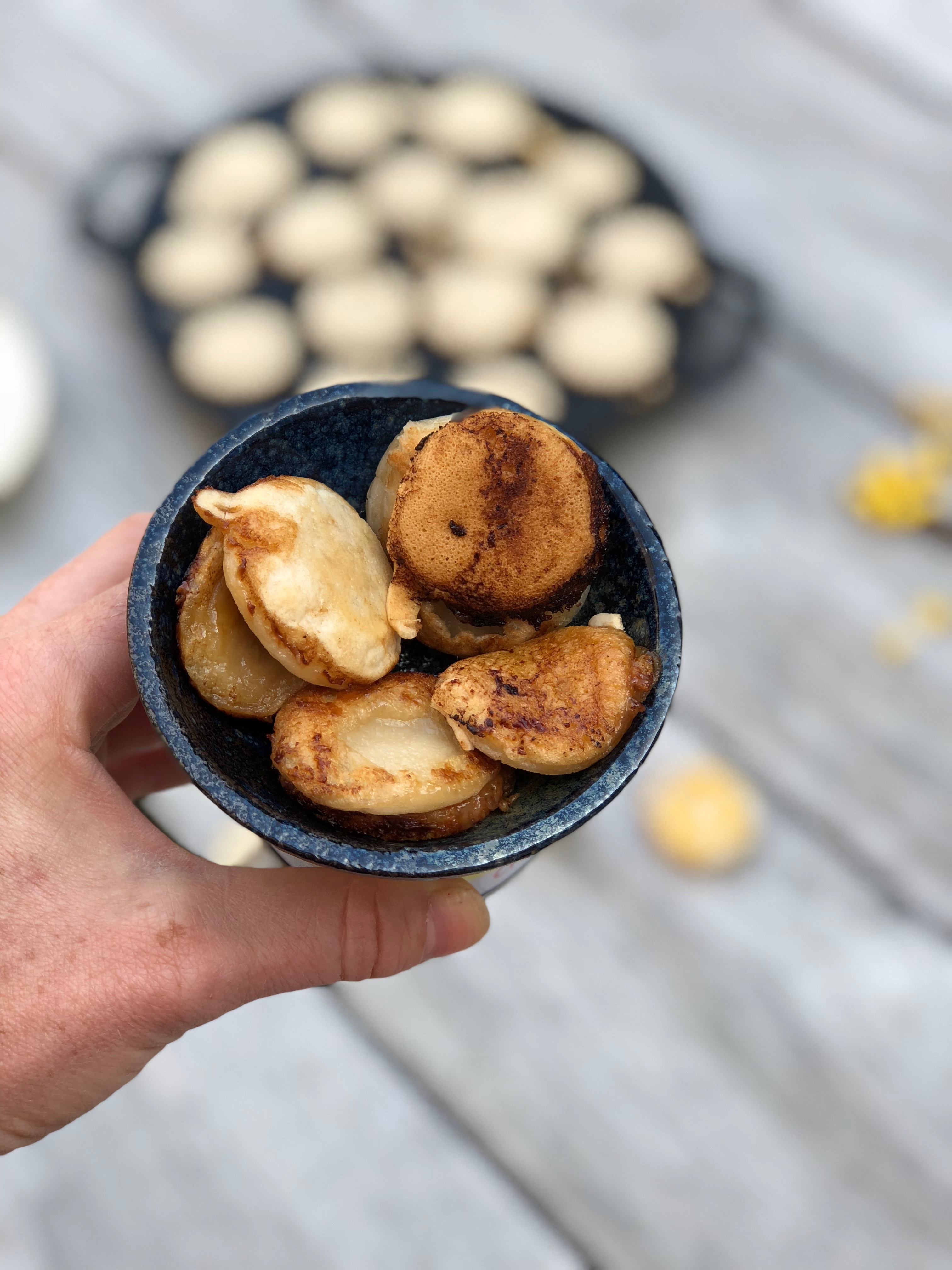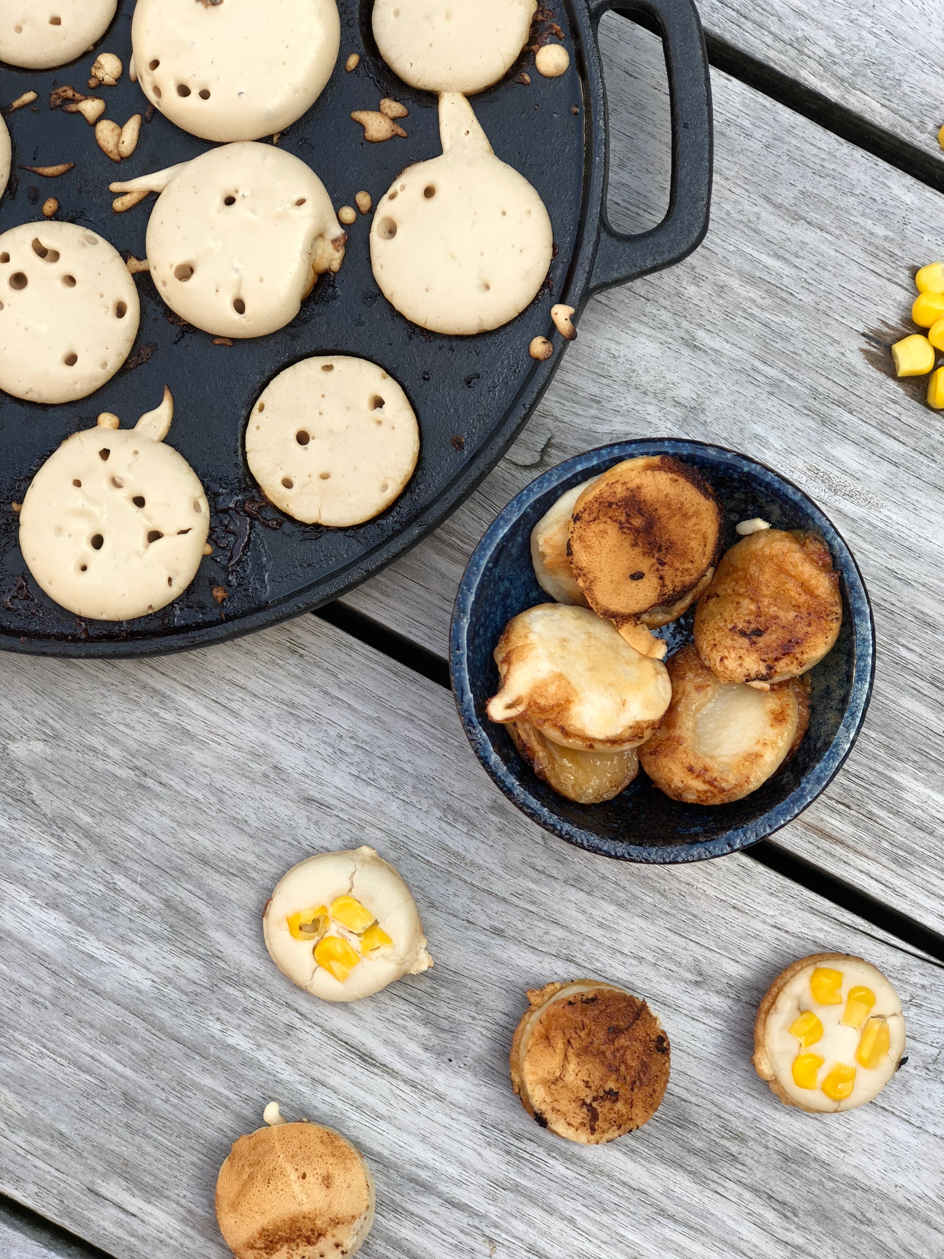 Eten maakt echt een belangrijk deel uit van onze vakanties en eens thuis blijf ik nog een aantal weken ‘vakantie’ eten klaarmaken. Deze poffertjes zijn hier een perfect voorbeeld van. Het eerste wat ik tijdens onze vakantie in Thailand gegeten heb, zijn een soort heerlijke kokospoffertjes of Kanom Krok. Zacht met een klein korstje langs buiten, smeuïg vanbinnen. Door het gebruik van rijstmeel durven de pannenkoekjes nogal aan je tanden plakken. Hierdoor waren de meningen bij ons verdeeld of het nu lekker was of niet.