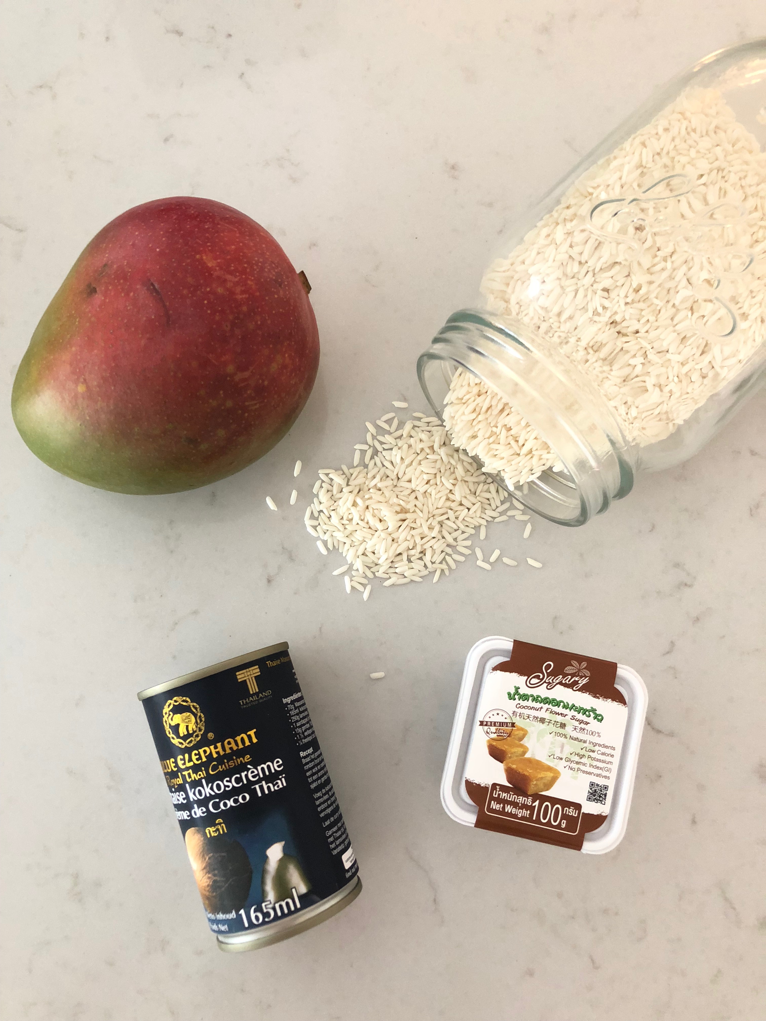 - Schil je mango en snij in mooie schijfjes of blokjes en serveer met de rijst. Werk af met de overige kokosroom en wat sesamzaadjes.