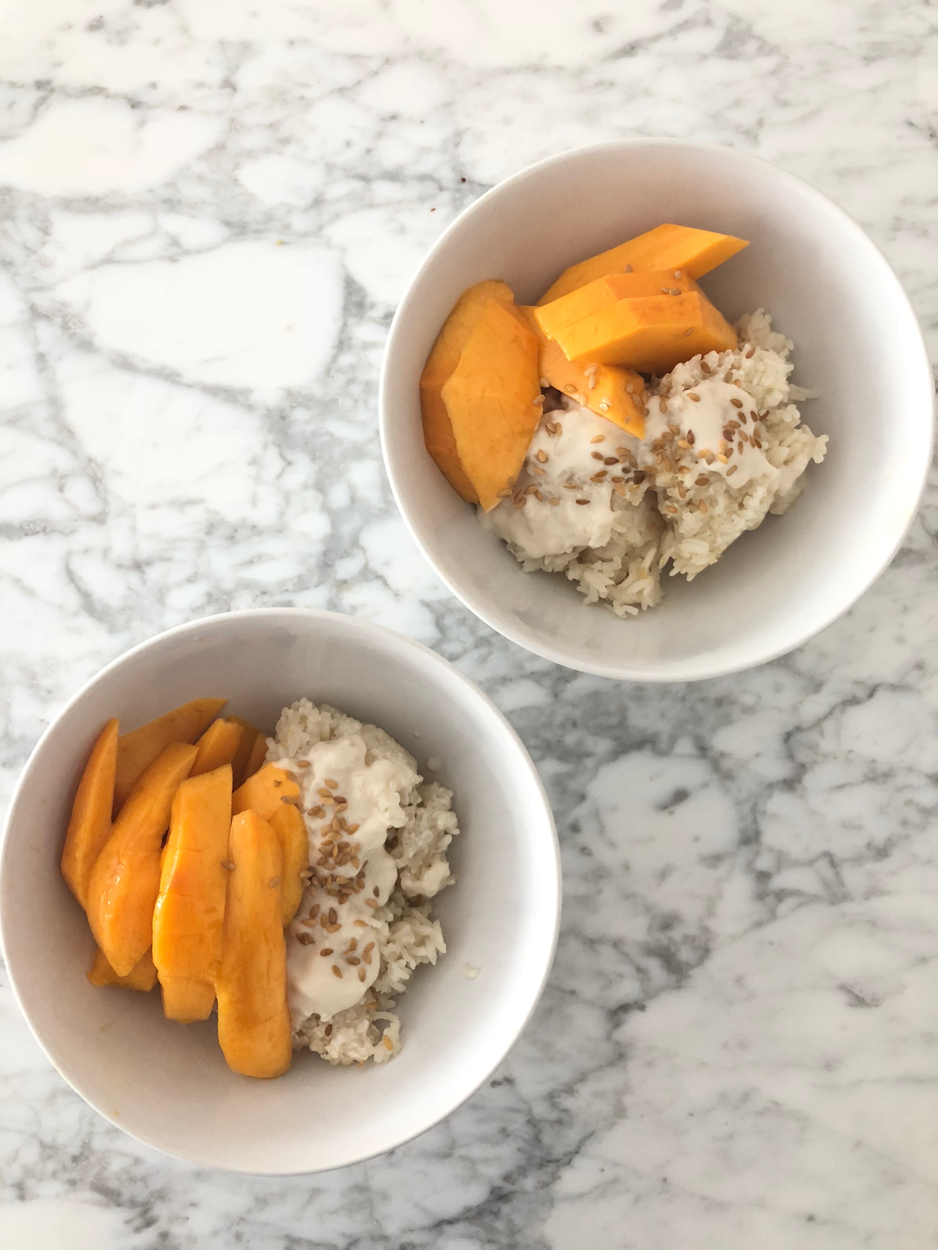 Serveer de rijst met wat sesamzaadjes en extra topping met kokoscrème en een rijpe mango.