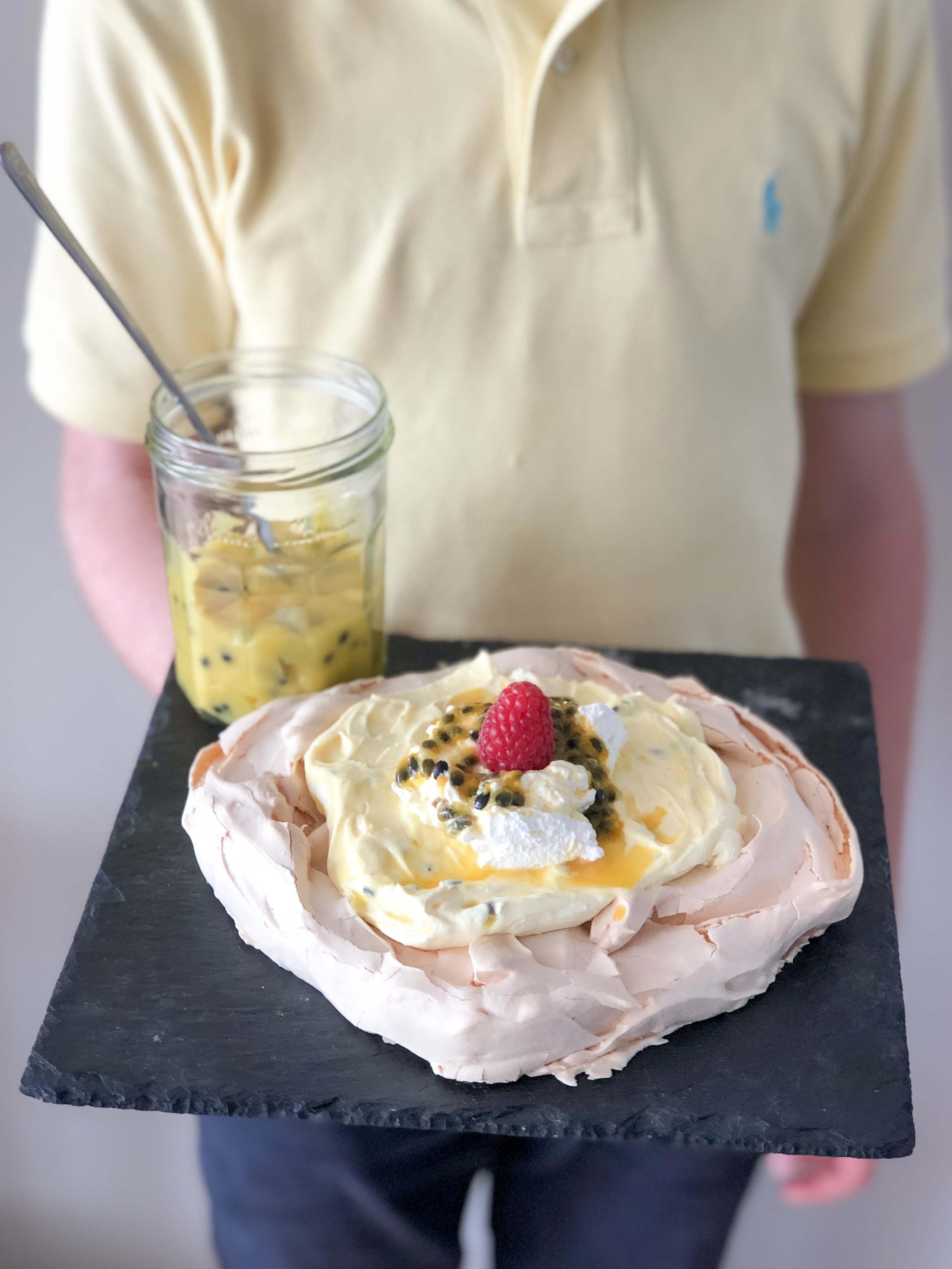 Laatst heb ik passievruchten curd gemengd onder de room en die dan op de pavlova gelepeld en afgewerkt met passievruchtenpulp en frambozen. Heerlijk! We weten wat we met kerst gaan eten als dessert.