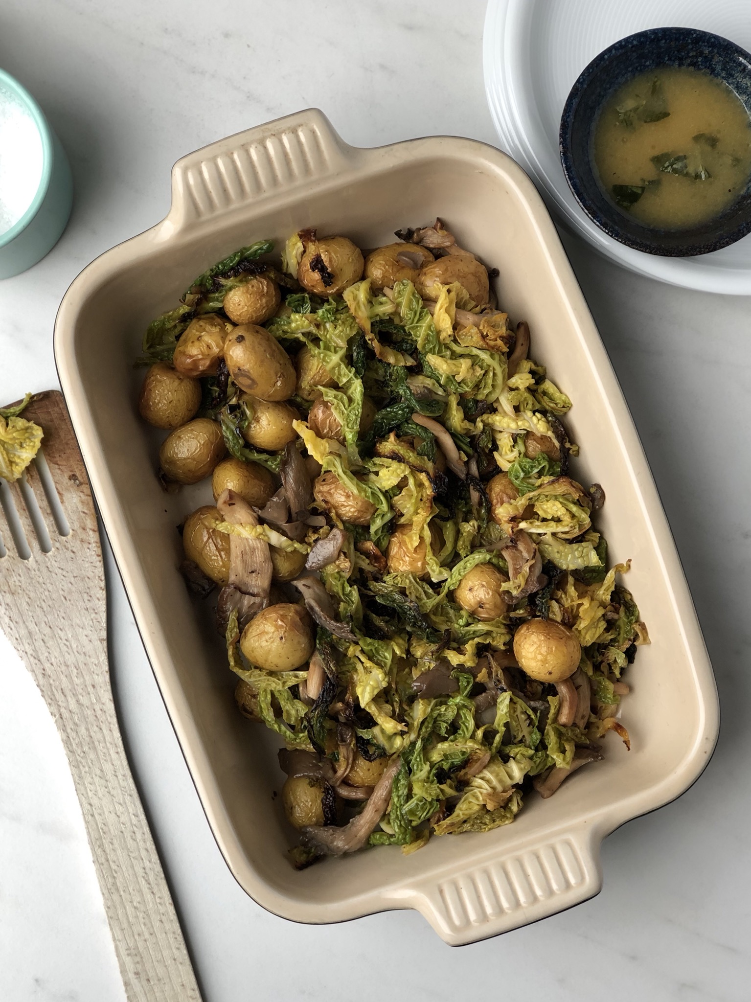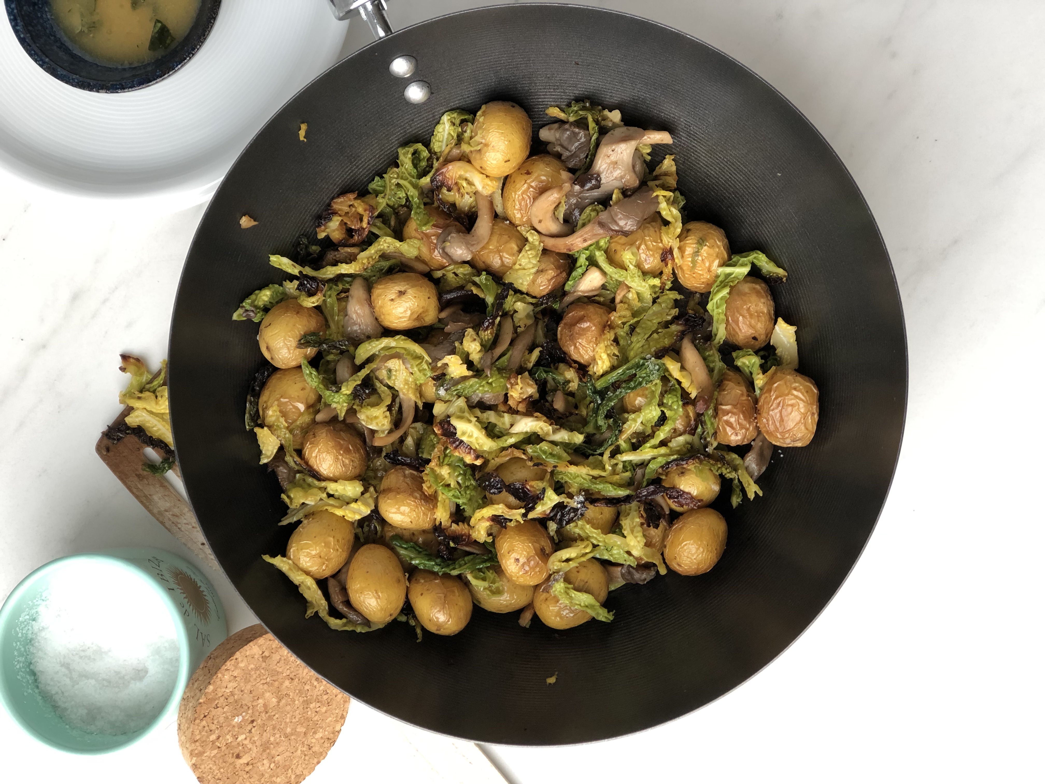 De kids hebben een aantal jaren geleden zelf een receptje met savooikool verzonnen en wilden dat deze week nog eens eten (hier kan je dat recept trouwens vinden mocht het je interesseren). Nu had ik echt nog wel heel wat savooikool over. Ik wilde eigenlijk eerst rolletjes maken gevuld met rijst en gehakt maar door tijdsgebrek is dit roerbak gerechtje ontstaan. Een overschotje gebakken krieltjes van de dag voordien, een overschotje champignons van de toast champignon die we woensdagmiddag gegeten hadden en voilà…Ik heb dit geserveerd met een stukje kabeljauw uit de oven en de dag nadien heb ik de rest gewoon als veggie lunch gegeten. Lekker met een honing mosterd sausje met wat tuinkruiden, meer moest dat niet zijn.