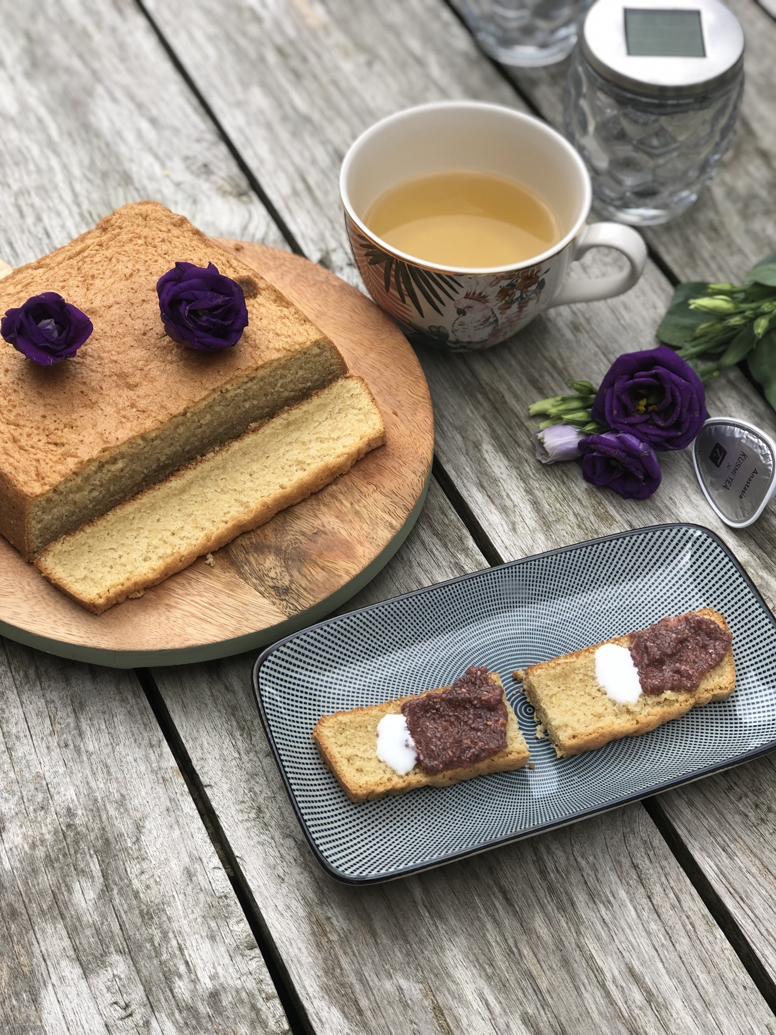 Ik gebruikte voor deze cake de Anastasia van Kusmi voor Special T. Dat is eigenlijk heel toevallig gekomen. Valentine wou cake maken en ik was net een tasje thee aan het zetten. Dat tasje is dus in het deeg verwerkt en ik heb er dan maar een nieuwe gezet. We hebben de cake gegeten met wat verse kokosroom en chia confituur.