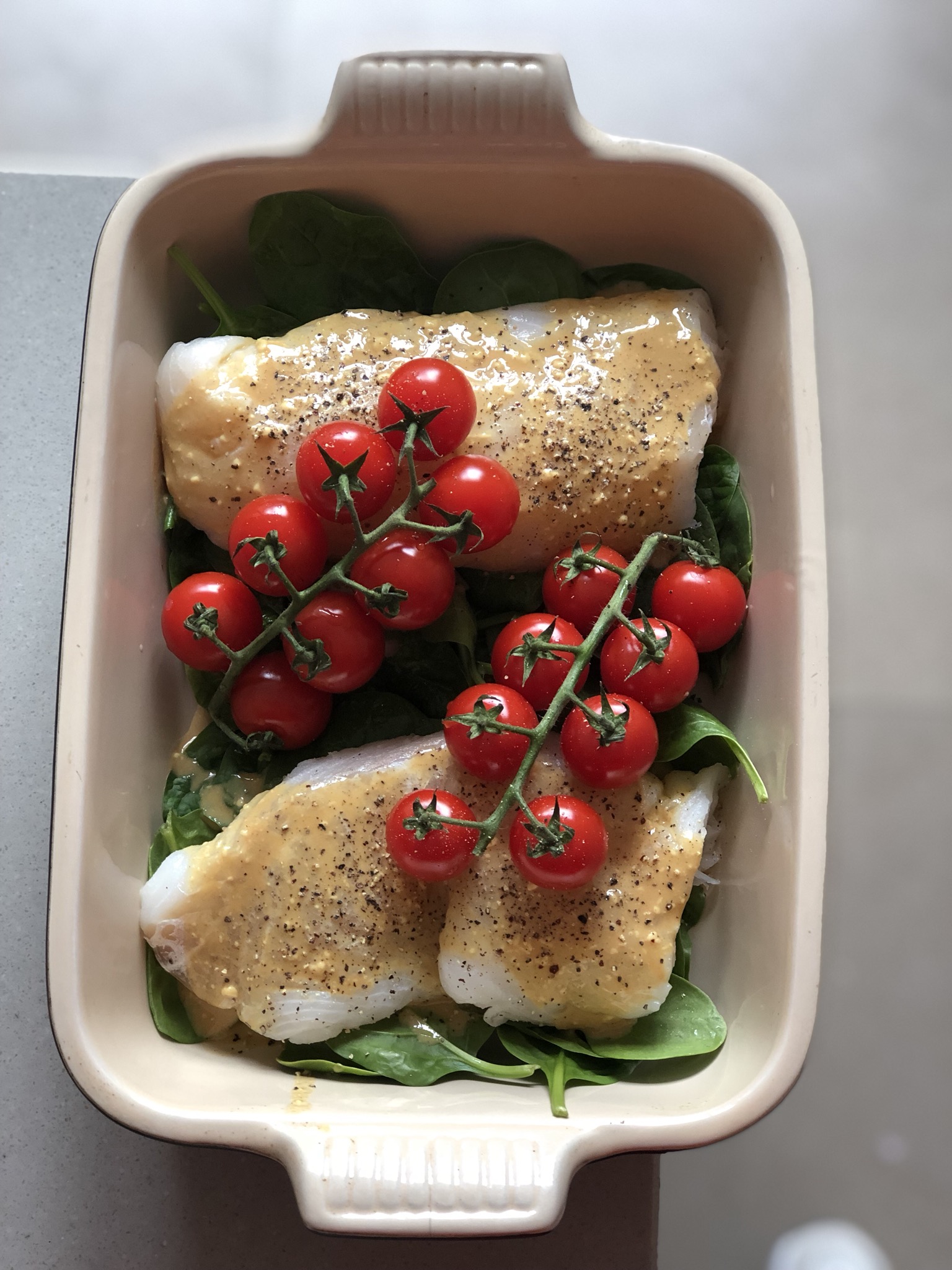 - Leg wat spinazie in een ovenschotel. Schik er de vis en de tomaatjes rond.