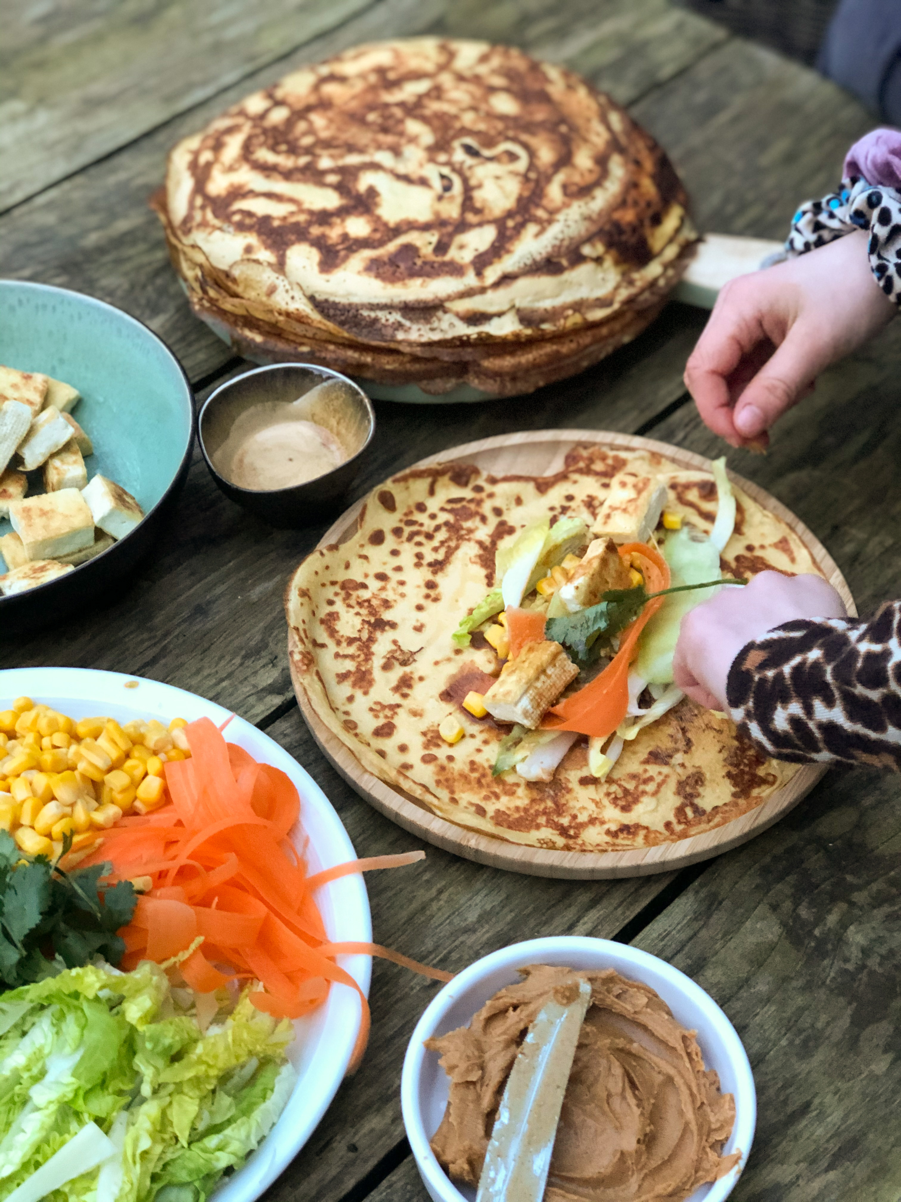 Bon back to Veggie Wednesday. Deze flensjes zijn superlekker, je kan ze op voorhand klaarmaken en iedereen hier in huis was er fan van. Besmeerd met een dikke laag pindaboter aka pindakaas, knapperige rauwe groentjes erop en dan wat gemarineerde gebakken tofu erbij. Oprollen en smullen maar.
